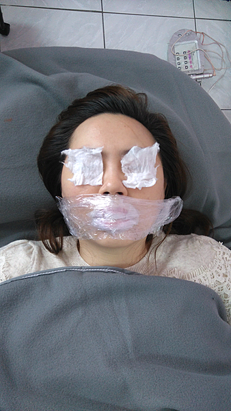 敷唇貼囉~保顯膜壓上效果才會更好~但我整個好像木乃伊的感覺~好好笑….哈.!