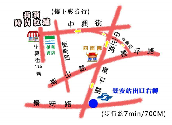 景安捷運站出來 ( 右轉 ) 延著中正路直走,看到第二個中興街左轉就到啦 ~ 約 7 分鐘 ~