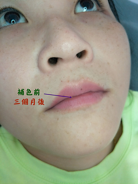 特別分享三個月後,唇尚未補色前拍的唇色給大家看,原本沒有血色的白唇,繡上桃紅唇,脫後的顏色淡淡的粉色,滿喜歡的~讚!!!