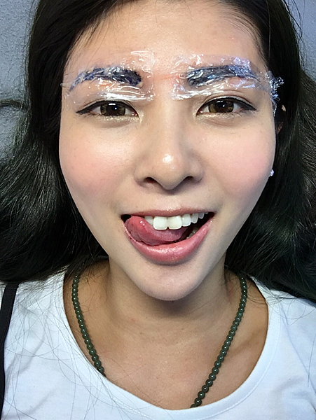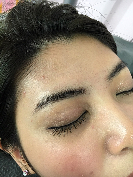 眉型雖然還在,但老師還是很細心,在幫我微調一下型~目前一邊的眉型確認好啦~~~~個人真的是比較偏愛有點微彎的感覺~比較不愛偏向平眉~因為我是個開心果~微彎的眉型比較適合我的個性,哈!!!(整體看起來好像無時無刻都很開心的感覺)