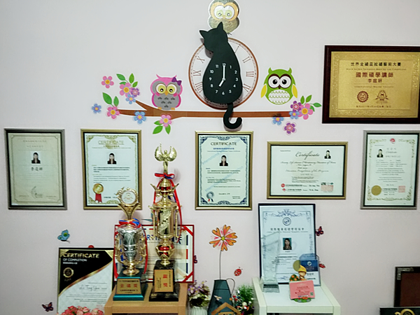 透過朋友介紹來到中和找Lili老師~今天看到工作室滿滿的證書還有獎盃~也當過國際紋綉大賽的評審~
